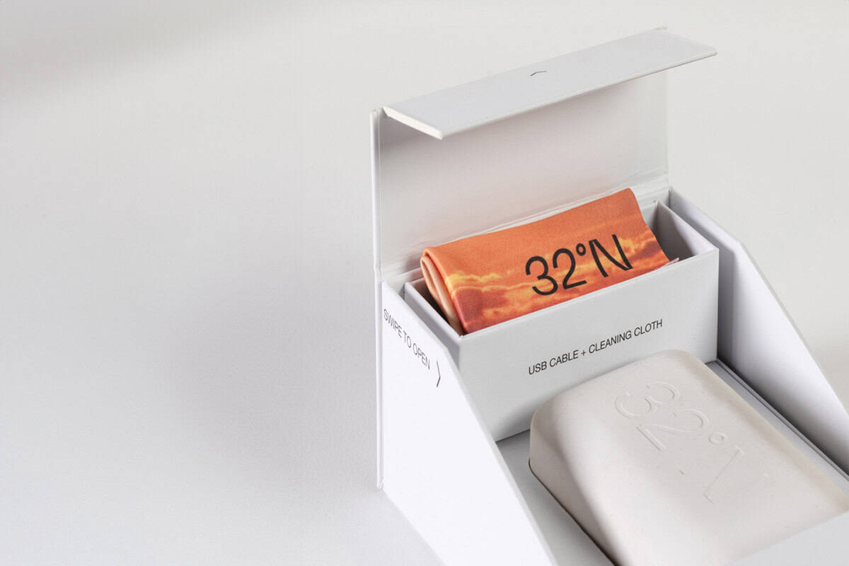 מינימליזם ועידון. אריזת המשקפיים עשויה מקרטון לבן קשיח, משלבת פתיחה ייחודית לאריזה על מנת לפתוח את האריזה יש לעשות תנועה של החלקה עם האצבע הדומה לחוויית השימוש במשקפיים.
